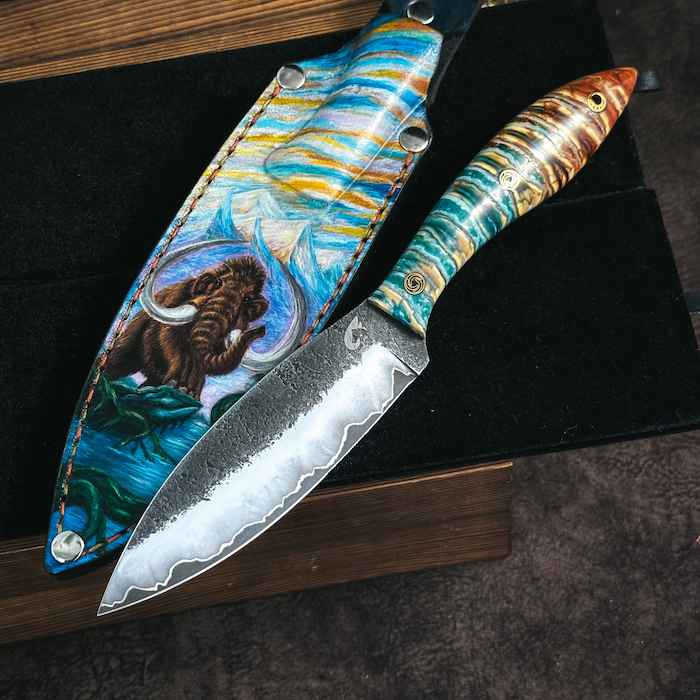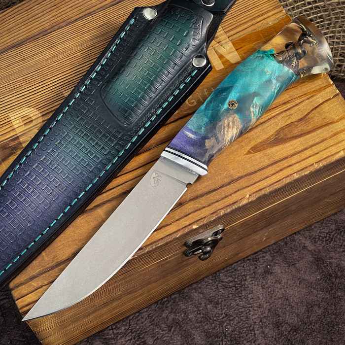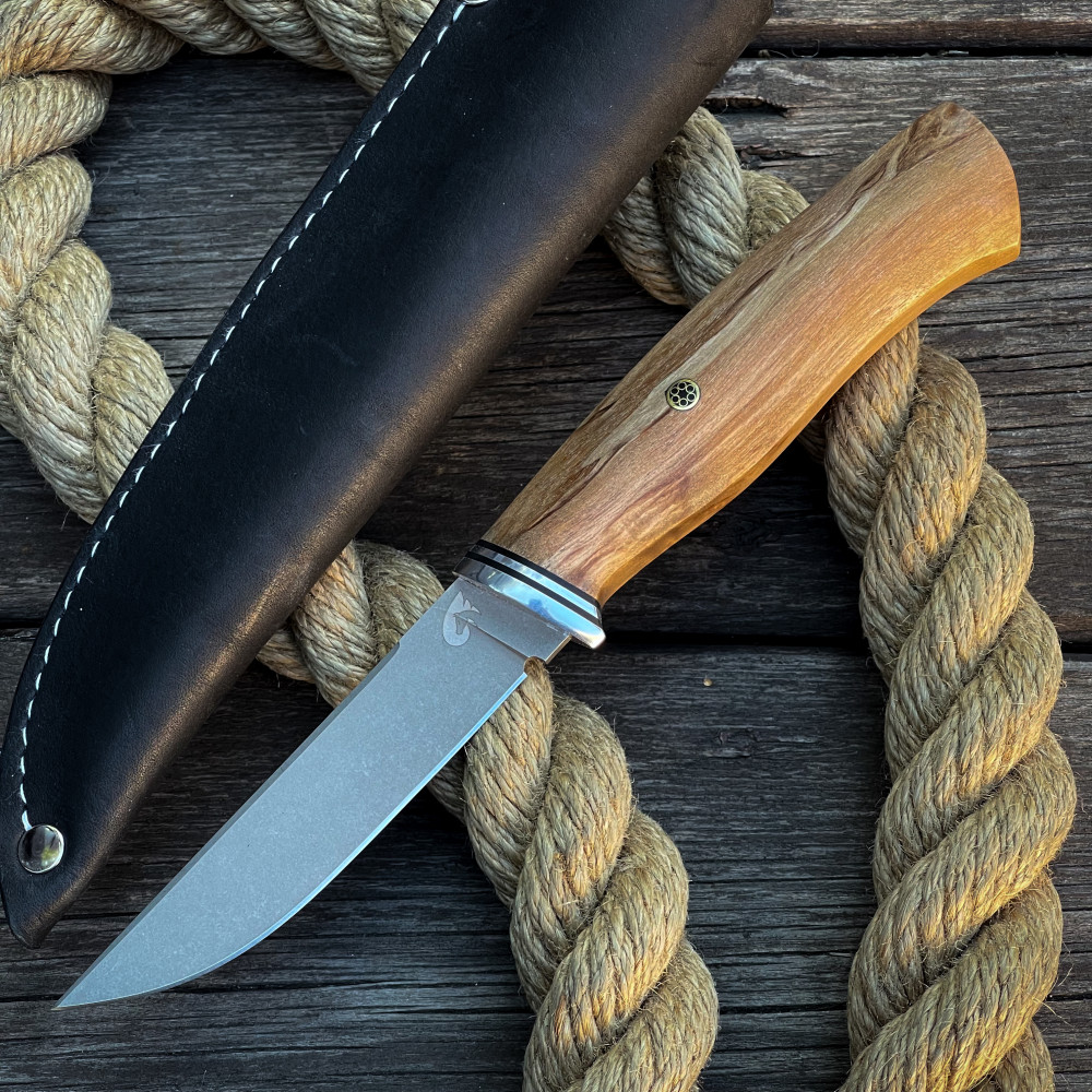 Каждое изделие отличается: у нас не бывает двух одинаковых ножей. Рукояти — это всегда уникальные материалы, индивидуальный подбор под рисунок, текстуру, вес. Мы тщательно подгоняем клинки, идеально подгоняем слесарку, шьём ножны вручную для каждой модели. Именно в этом и заключается наша философия.