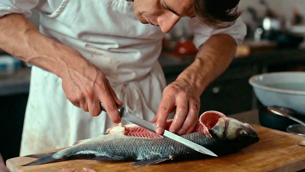 Работа с коротким филейным ножом требует подготовки, но после пары попыток становится интуитивной. Сначала убедитесь в остроте лезвия — оно должно скользить, а не давить. Используйте нескользящую доску или поверхность, чтобы рыба не ерзала, и работайте слегка влажными руками для лучшего хвата. Начните с фиксации тушки: положите её на бок, головой от себя, и сделайте первый надрез за жабрами, ведя нож вдоль позвоночника до хвоста. Короткое лезвие здесь идеально — оно позволяет чувствовать каждую кость и обходить их без лишних усилий.