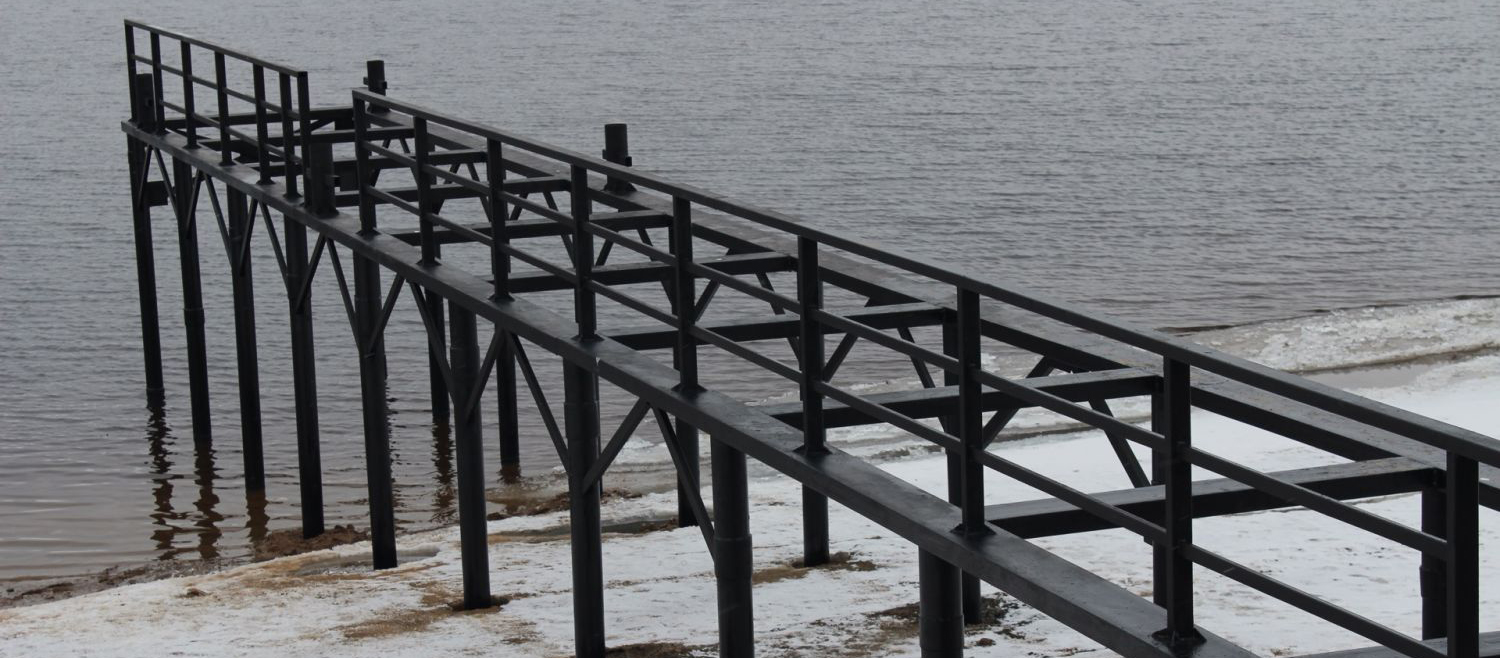 Металл чаще всего используют для каркасов причалов или в качестве свай. Преимущества: это прочный и долговечный материал, который выдерживает серьезные нагрузки. При правильной обработке антикоррозийными составами металлические конструкции могут служить десятки лет. Если вы живете в регионе, где река замерзает, металлические сваи лучше всего переносят подвижки льда — они не трескаются и не ломаются.