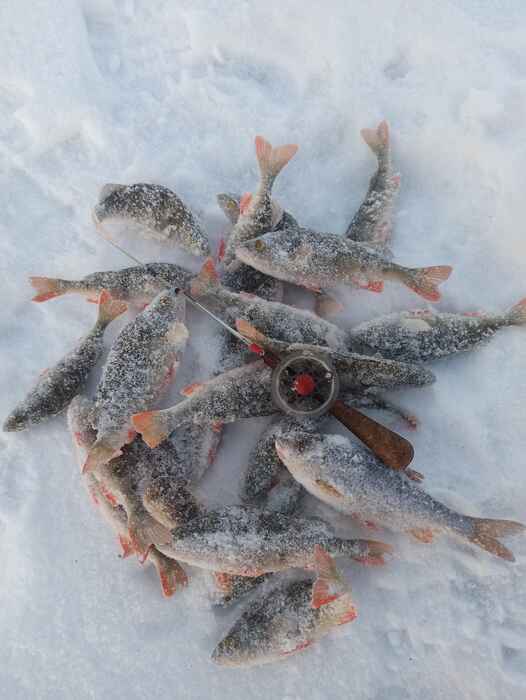 Сегодня побывали с приятелями за тарелкой. Пошли сразу далеко, чуть не до Товарища. Я сразу где-то на середине закормил три места, воткнул палочки. Стали ловить у берега окунька. Точнее, вымучивать. Клевало очень вяло, если это можно было назвать клевом и только пиписочныго размера. Долгожданного вздрагивания кивка я не увидел и пошёл проведать свой заветный пупок. Друзья отказались, далеко топать... А зря, там хоть как-то поклевывало, нацарапал 17 матросиков, за час, хоть что-то... Звоню напарникам, а они уже на прикормленных лунках сидят. На одной лещ оборвал мормышку, одного подлещика вытащили, на другой сорога жрёт прикорм со дна, но не клюёт. На третьей пусто. В общем, я подкормил ещё, посидел с полчасика (ни поклёвки) и пошёл к берегу к напарникам ловить окунька. Ага, если бы... Удалось изловить одного пиписочного и всё. В общем, потянулись мы к моему секретному пупку, на котором глубина метр, два, не больше... Пупок принёс мне ещё 5 окуньков, друзьям же ничего, хотя лунки были в паре метрах друг от друга... Вот что значит вера в место ... А уже и вечер, пора домой. В общем, выводы следующие. На небольших глубинах лучше лунки не засвечивать, а оставлять в них снежное месиво в котором палочкой делать дырочку, чтобы прошла мормышка. Не шуметь санями, шуруповертами со скоростным бурением десятков лунок, не греметь алюминиевыми коробами, не обстукивать бур... Просверлил, проверил лунку, уходя присыпал снегом и пошёл дальше...
