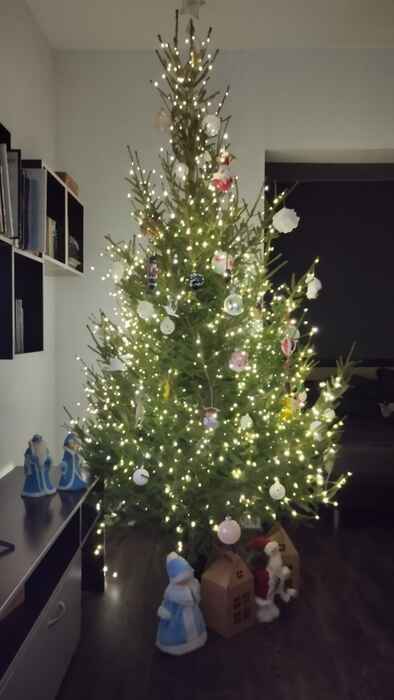 А мы уже лет 5 как не ставим никакую елку. Много возни с ней.. Другое дело, когда дети-внуки, подарки под елочкой.. Живую елку жалко губить.. Да и сыпется она... много мусора. И у милой запах хвои ассоциируется с другими, не очень праздничными делами.. как и запах сирени. Была у нас искусственная небольшая пушистая с пучками световолокон на кончиках, которые красиво подсвечивались-переливались.. никакой дополнительной гирлянды не надо было. Лет 15 прослужила.. поистрепалась. После нее никакой другой уже не хочется покупать-ставить. А таких сейчас нет. Поэтому без елки.. Гирлянду-штору на окно вешаем красивую, мишуру пышную туда-сюда и всё... .