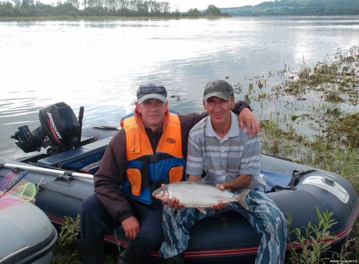 с лодки.