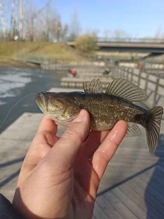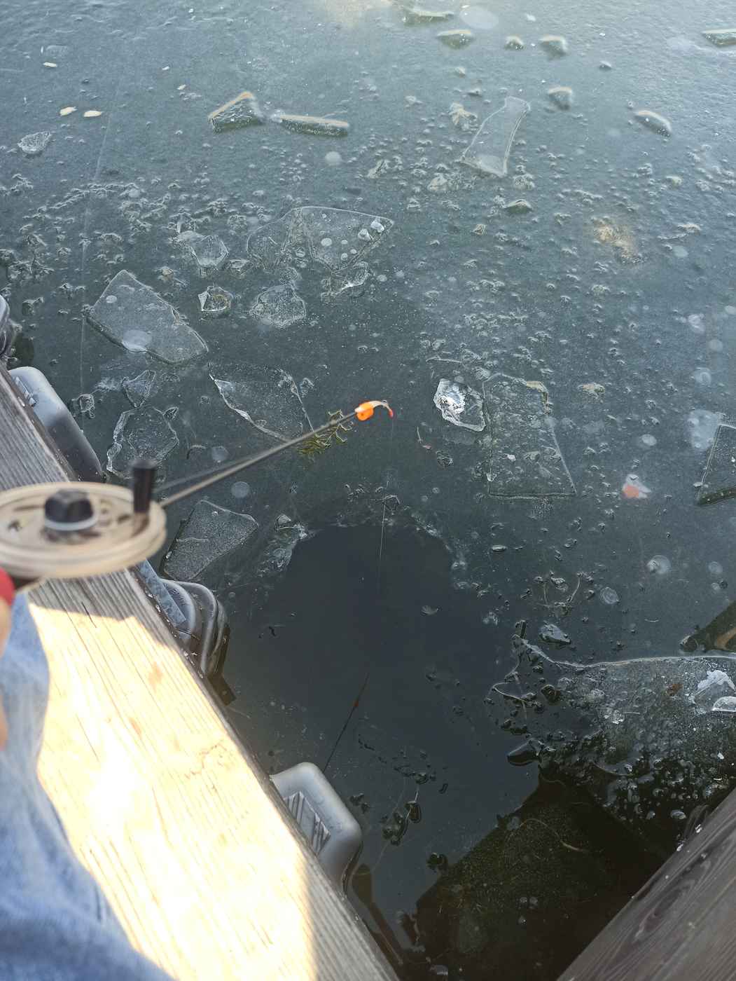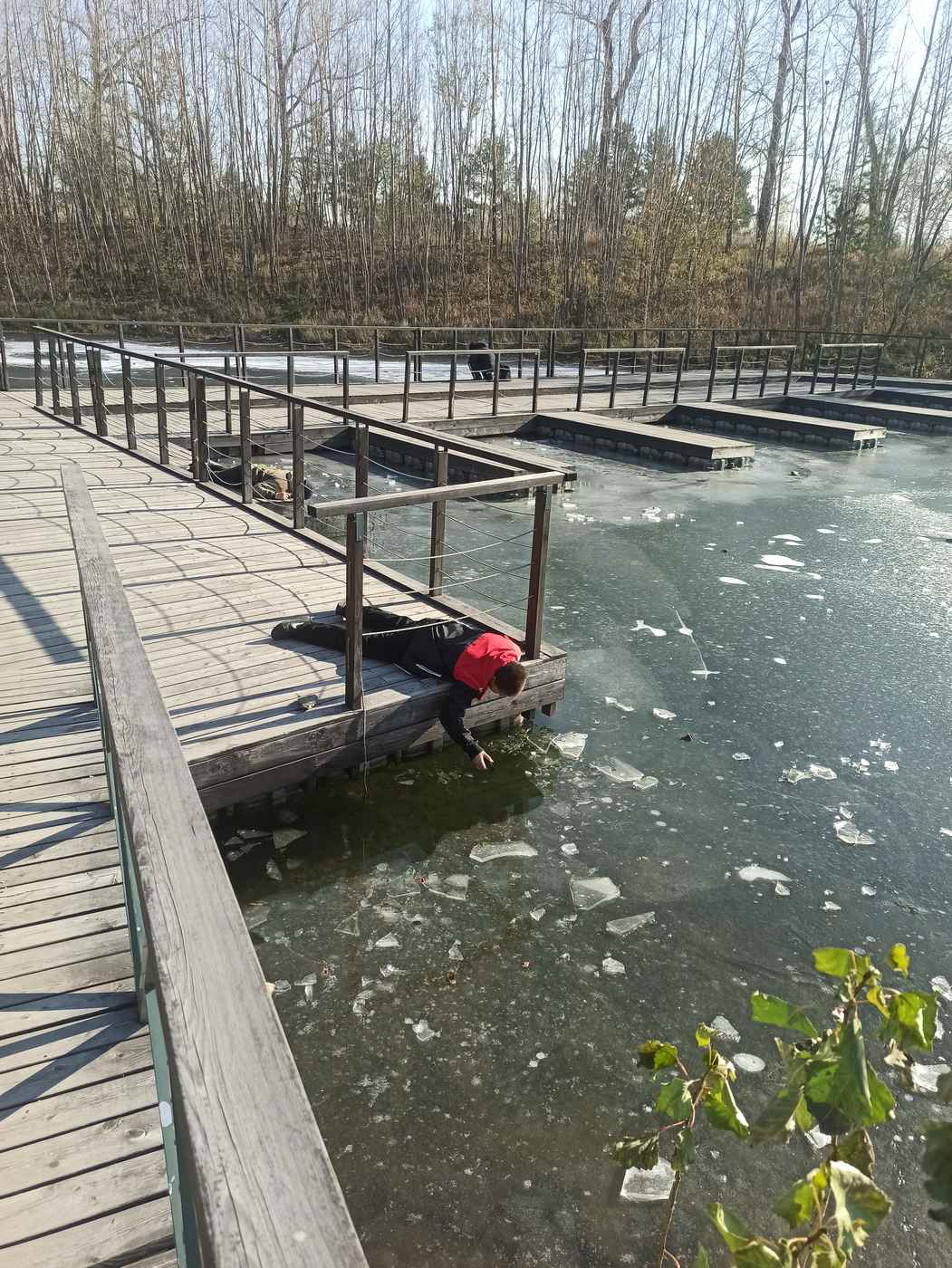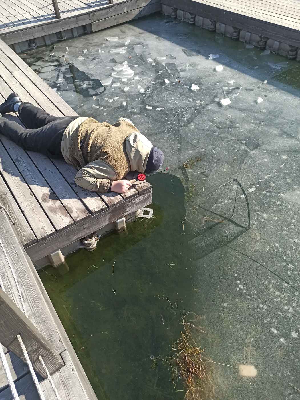Ну, думаю, я уже наловился, зуд снял. Пошёл по мостику к единственному пятачку с открытой водой, помню, что там было поглубже и много травы под водой, там должно быть что-то интересное. Из интересного там были ондатры, насчитал четырёх. Постоянно сновали туда-сюда, выныривали из подо льда с пучками зелёных водорослей в пасти и поедали их. Я взял ротанчика и бросил одной прямо под нос... Ноль внимания... Подтолкнул рыбку удочкой прямо ондатре в нос. Повернулась - обнюхала удочку, и... продолжила с аппетитом наворачивать... Водоросли... Ну прямо крепкий веган-орешек! На обратном пути посидел немного с поплавочкой на другом озере, сорожьем. Тихо. Покосился взглядом на понтоны пристани катамаранов. Всё закрыто и пусто, а что если... Но, это уже будет совсем другая история...
