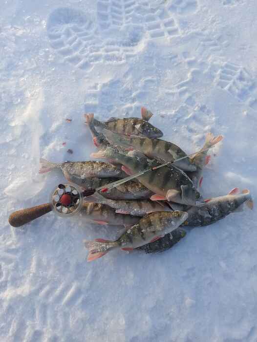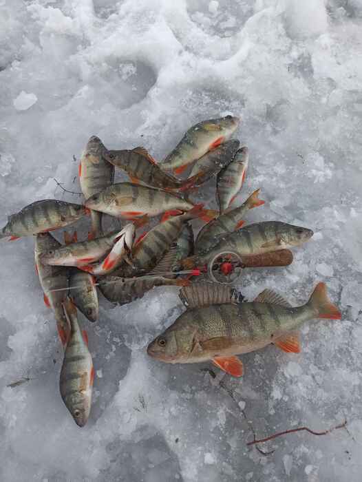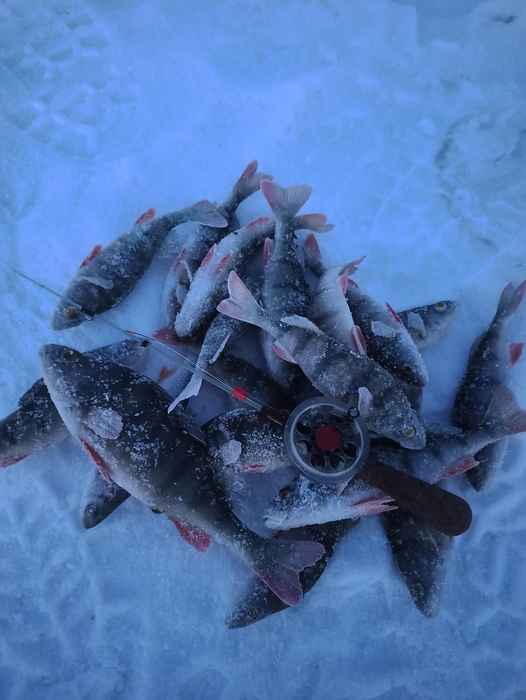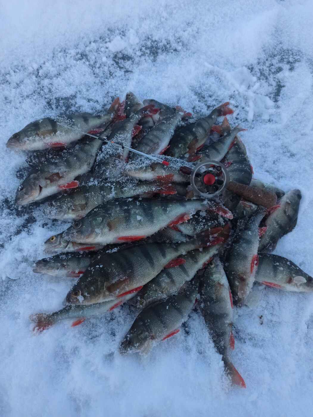 Сегодня сбегал на три часика. С 10 до 13. Окунь не клевал... Пошёл посидел над сорожкой. Потом вернулся на пупок, опять тишина, стал искать и нашёл продолжение пупка с кучей окуня, но клевал и там слабо... Хороший кабанчик в лунке помахал мне хвостом, а так мелочь, но приятно.
