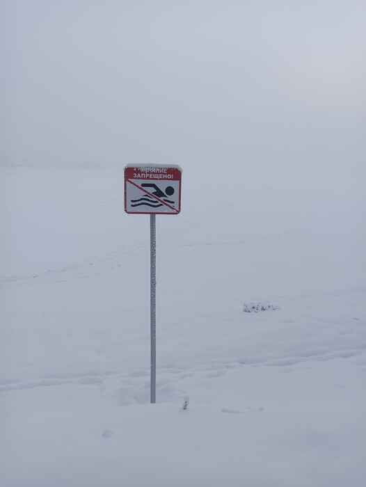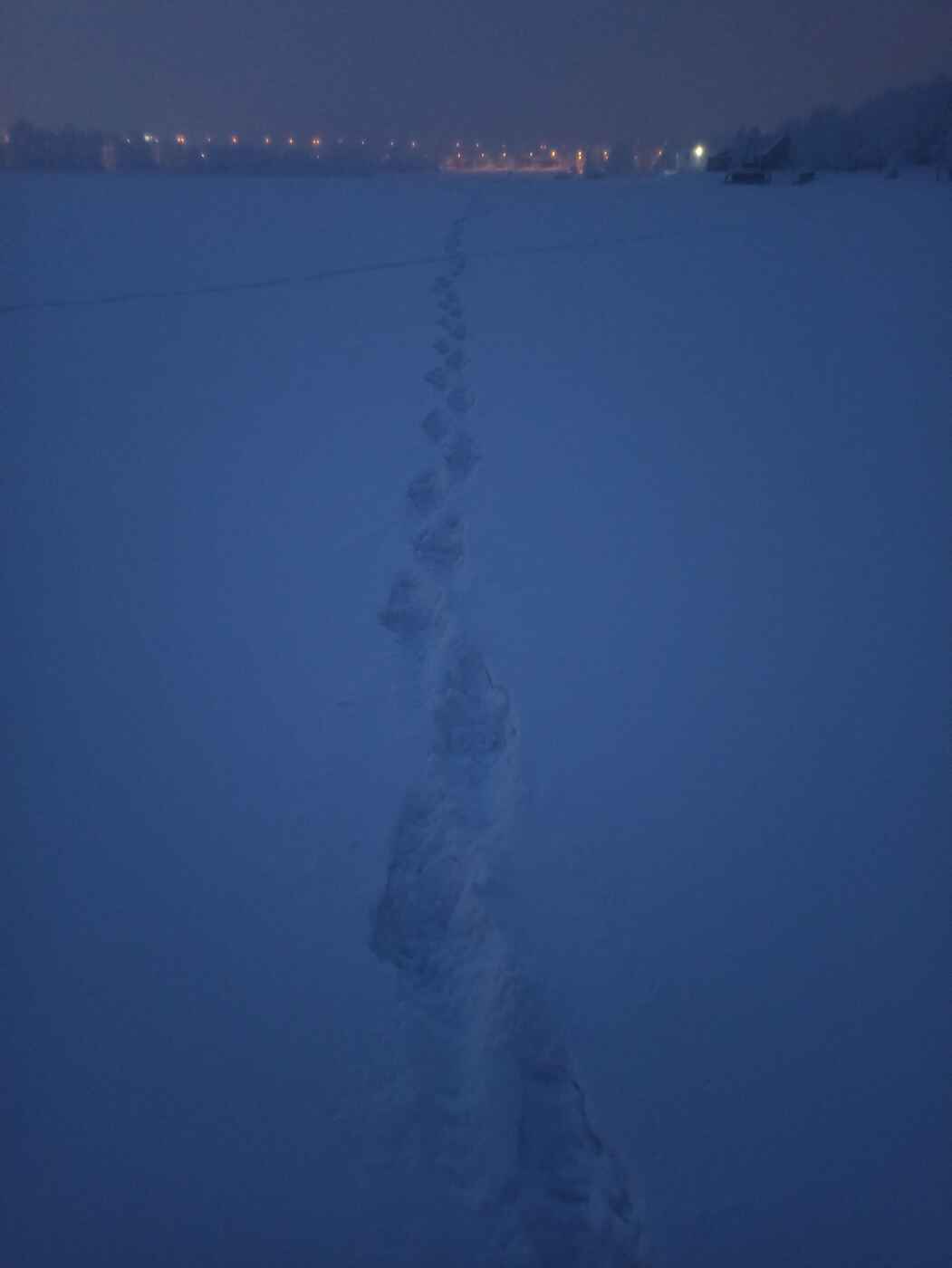 В общем, устроился, зябковато, ну да ладно, так всё равно лучше, чем на улице. И руки над свечкой можно погреть. Вскоре стало поклевывать. Нечасто, но всё же скучать не приходилось. Был такой момент, когда хотелось одну удочку сложить, всё мешалось друг другу и путалось от одновременных поклевок. Был ещё забавный момент, когда слишком резвая сорога рванулась под лункой, но не туда. В итоге она просто выскочила из лунки мне под ноги  В общем, пробыл я в добровольном заточении весь день и скажу я братцы вам, что мне там понравилось. Был ещё забавный момент, как к моей палатке подошёл рыбак, спросил, как клёв, а я ни дверь ни могу открыть, ни форточку. Пообщались так, заочно Услышав мой рассказ о больших сорогах и поверив мне на слово, рыбак забурился рядом и поставил палатку. Эх, доверчивый же народ, рыбачки!  О процессе. Процентов 80 поймал на тонкую снасть. Тульская дробинка 0,28гр. Всё на стоячку. Какие я только проводки не делал, вообще игнор. Чуть стало смеркаться, клёв сошёл на нет. Пора собираться! Я вскрыл дверь и выполз на свободу Ого, да тут дубачок, однако! В общем, решил оставить палатку на месте, написал на снегу "Дом рыбака. Рыбачьте, кто хотите! " Собрал рюкзак и потопал обратно по своим же следам.