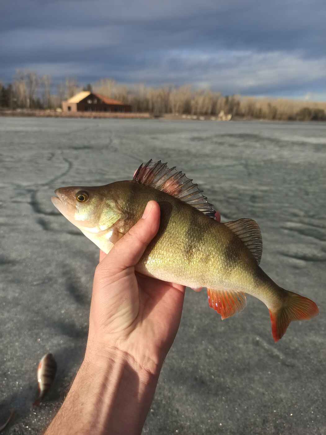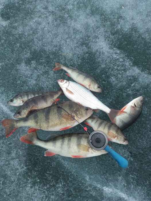 Сегодня отрыбалил за тарелкой. Прибыл поздновато, часам к 10, на протоке человек 10, не стал искать окушка, а пошёл на место, где был в прошлый раз, по пути закормив ещё одно место рядом с травой. Прибыл, снова закормил. Прождал часа полтора, ветрина, конечно сегодня ого-го! После нескольких полётов и догонялок, боялся оторвать зад от горшка. В общем, белую рыбку я не дождался, вымучил пять окушков, троих из которых отпустил. Плюнул, собрался и направился на место у травки, а там уже дедок сидит. Подошёл поближе, не, не на моих лунках, рядом. В камеру увидел пару сорожек, затаборился. Но... Правильно, не клюёт. Кошусь в сторону своего "секретного" Пупка, а там, прямо на нём сидят двое... А там же, буквально десять на пять метров площадь-то его... Снова плюнул и пошёл к берегу физкультурой позаниматься. Окуневой. Лёд под ручку бура, да ещё и мокрый, пробурил три лунки, на каждую по семь проводок и дальше... Чем не спорт?  Под берегом вода из лунок пошла, прямо на глазах стало всё топить, промок рюкзак. В общем, наковырял штук пять и с пяток отпустил. Сижу, ловлю, слышу шаги, парень подошёл, высыпал в мою лунку остатки мормыша и мотыля. Говорит, вчера сорога стала клевать с трёх часов, приятель рыбачил... Поблагодарив его за такой бонус решил обследовать район вокруг закормленной лунки. Выяснилось, что рядом, шагах в двадцати яма, а в другую сторону равномерный стол с глубиной метра три-четыре. Но окуня практически нет. Вернулся на закормленную лунку, а там сорока в камеру заглядывает, правда одиночная. Бурю вторую лунку, опускаю тонкую снасть, сижу, жду. Время три. Кивок поднимается. На автомате откидываю телефон перед собой в снег и подсекаю - есть сорожечка! Вытаскиваю мормышку изо рта и только тут замечаю лежащий перед собой телефон в водяной каше... Вроде пронесло, работает... В общем, вымучил я три сорожки и всё... Сидел, сидел, думал уже на закормленное место ближе к центру, что у травы возвращаться проверить, но краем глаза увидел, что двое горе рыбаков с "моего" пупка сматывают удочки  Собираюсь и иду к берегу, к пупку. Дохожу, время 16:45. На протоке никого, кроме одной лягушки. В смысле палатки. Блин, ребята просверлили четыре лунки и просидели на них весь день. Вот это упертость! Но в точку они не попали бурю лунку в "точке", два окунька, потом подряд три лунки-точки. Пошло веселье! , дразню окушка быстрым дриблингом, подергивая хлыст между указательным и большим пальцем, Окунек не выдерживает.. На очередной точке очень мелко и при подсечке взмахом зацепляюсь мормышкой за край лунки подо льдом. Палочки рядом нет, засучиваю рукав и шумовкой пытаюсь отцепить мормышку, не получается, рву... Смеркается... В общем, хвостов пятнадцать успел поймать. Пять отпустил... Усё. Домой.