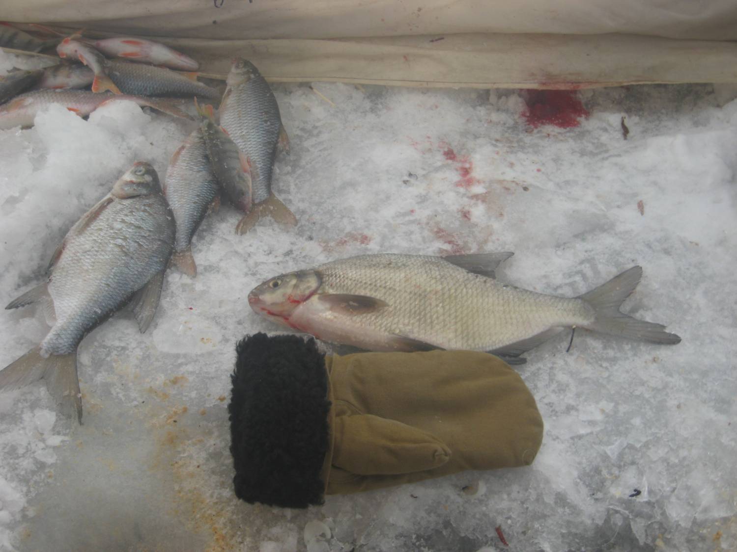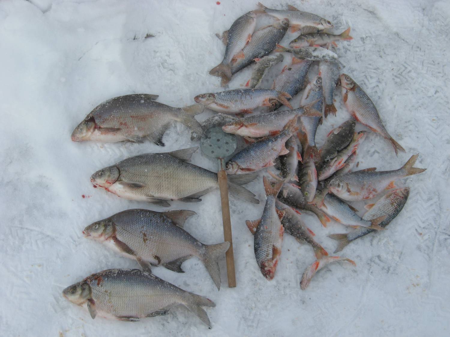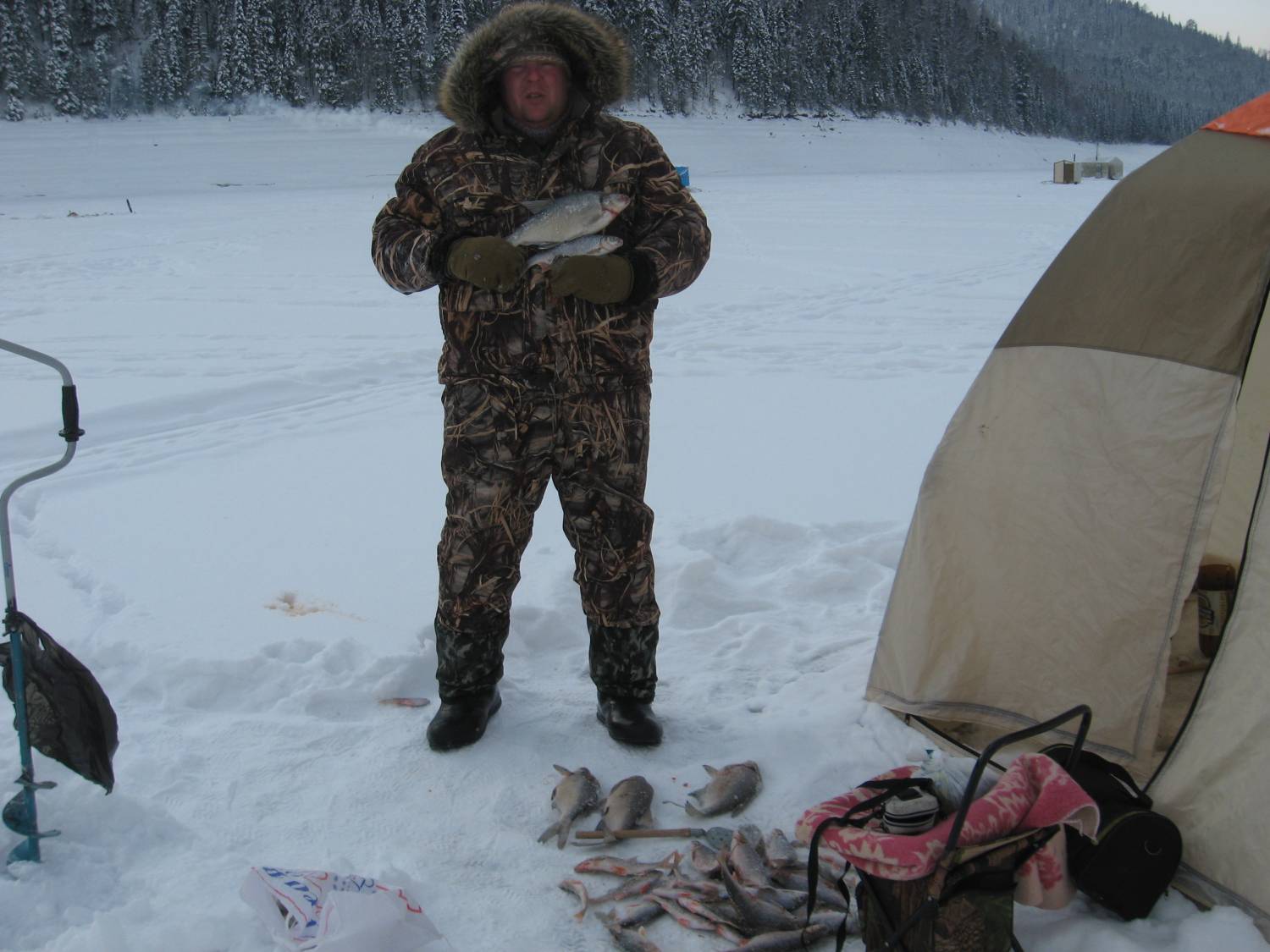 24 были в подпоре. Несущаяся по льду радостная собака с огромным лещём в зубах внушила оптимизм. Мужик с черпаком преследовал её не долго... . Видимо у него их (лещей) много. Сидели на одном месте. На стоячку сорога, потрясёшь окунь. Наживка- мотыль с опарышем.
