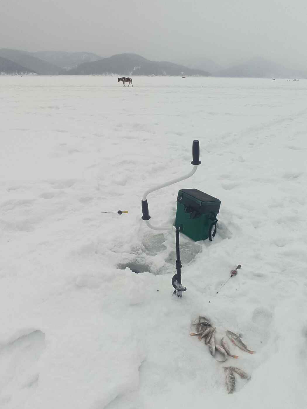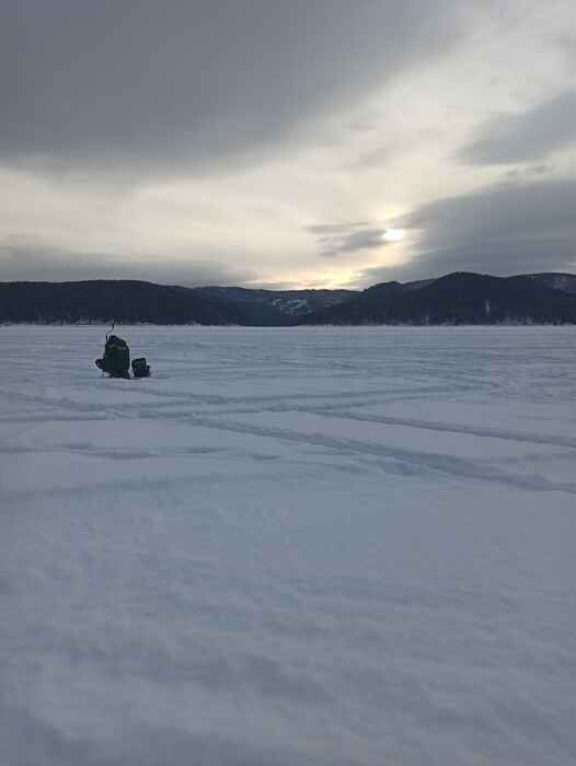 Побывали с другом в районе Листвянки - базы Маяк. Клевало слабовато, но кое-чего в итоге вышло... Часам к 16 пробурили удачную лунку, без неё бы было совсем печально.. Хотя, не так выразился. Печалью на рыбалке и не пахло. Сидишь, задаешь игру мормышке (по простому - дрочишь))), а вокруг тусня - вон там вдали группа на парашютах катается по снегу (не знаю как это называется)), по зимнику едет бесконечное разнообразие вездеходов, квадриков, жужжат собаки, срывает ветром палатки, кто-то катается на лыжах, а кто-то на плюшках, зацепившись за машину... Потепление пришло! Наступил последний месяц зимы! В воздухе витает запах шашлыков и слышен смех!