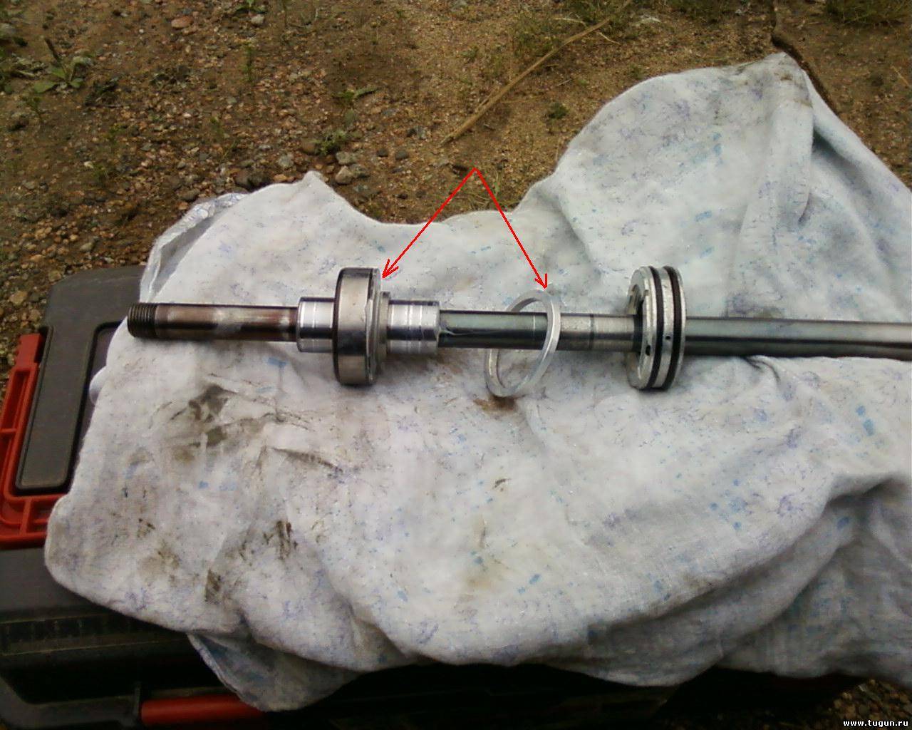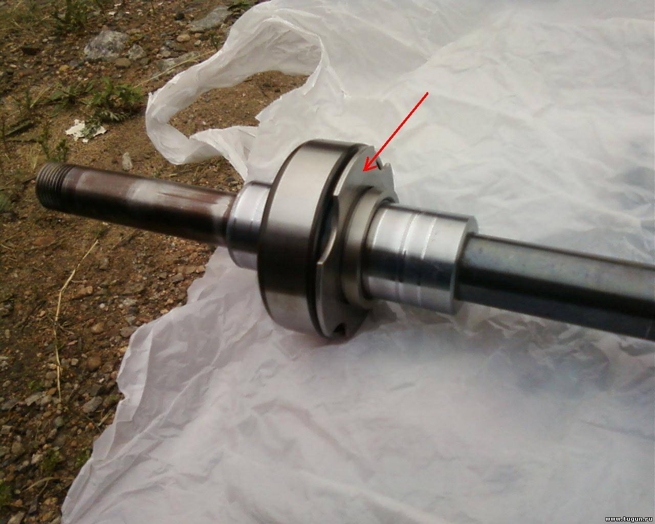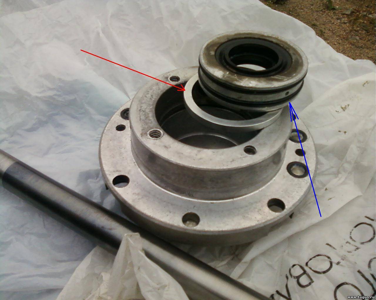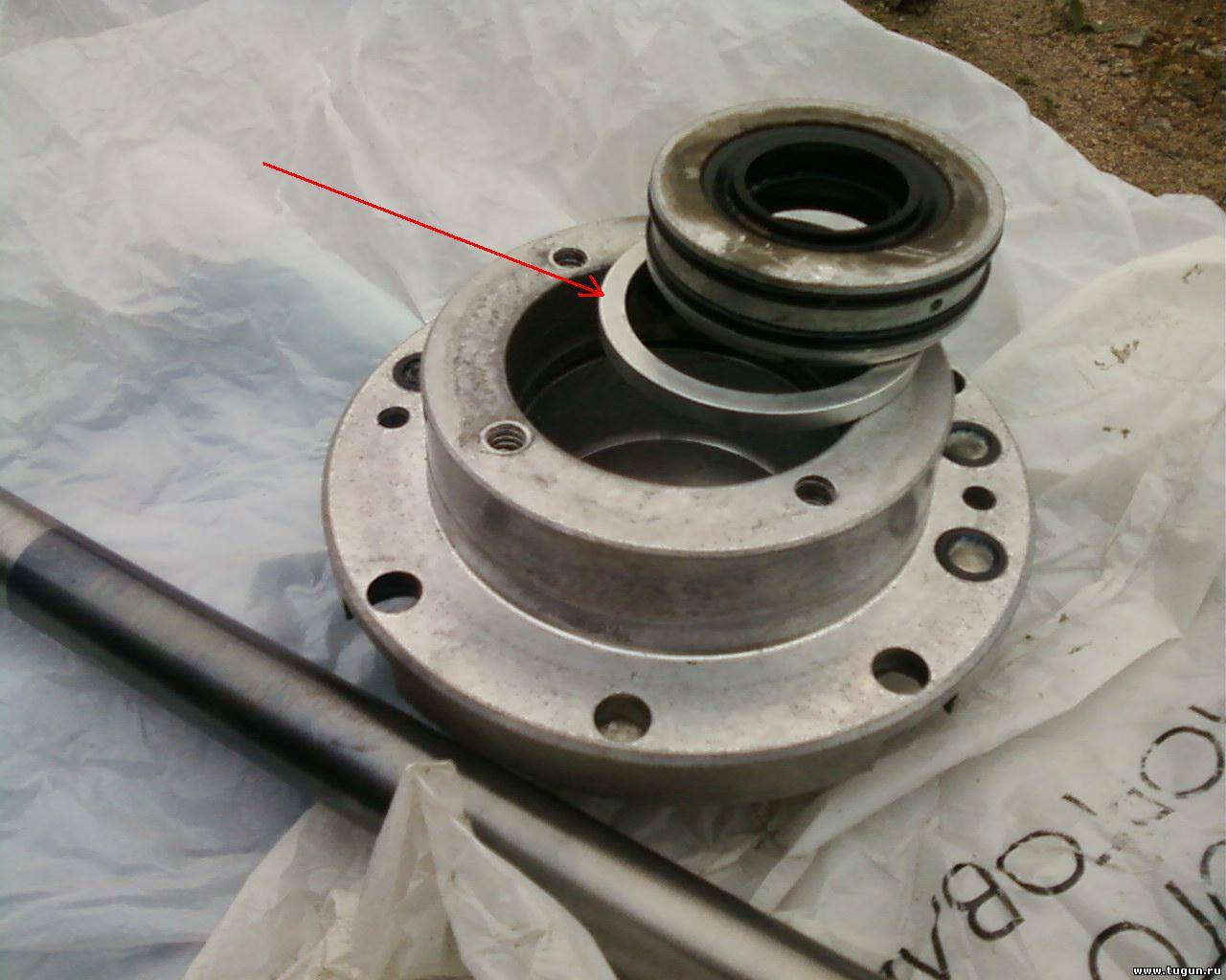 Здесь, в корпусе,(третье отверстие слева, немного за корпусом с резиновым колечком, под красной стрелкой: По поводу кольца и шайбы над подшипником - все нормально, опорным кольцом шайба прижимается к обойме подшипника, а в отверстии шайбы свободно вращается вал.