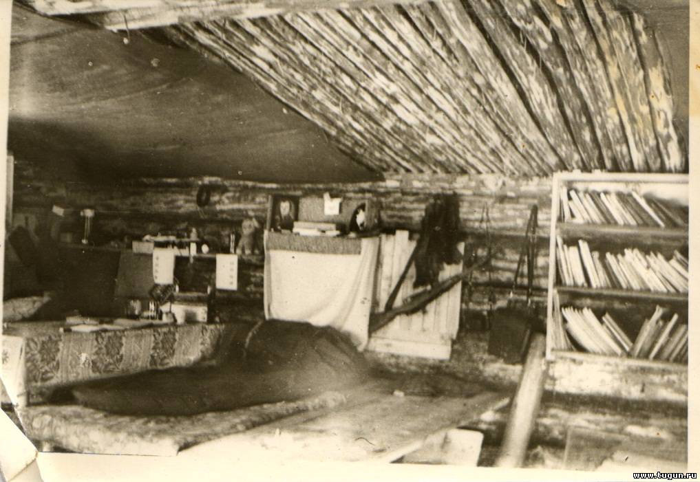 Да, со входа...За столом еще одни нары, слева печка -бочка и обеденный стол, справа от крниг и журналов - светостол.
