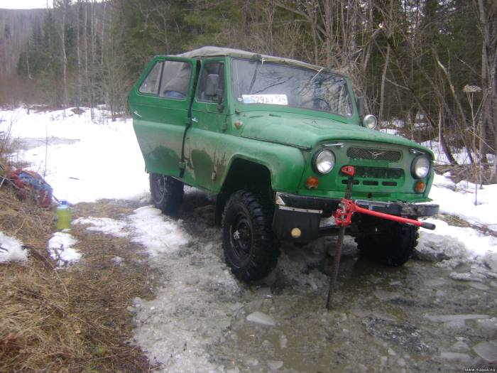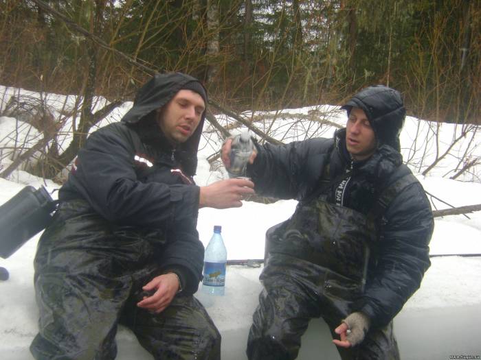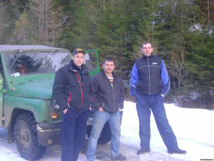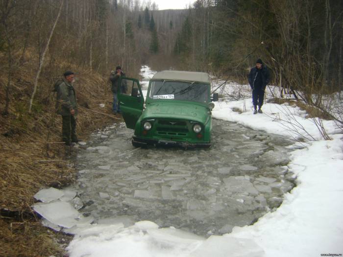 Наступил апрель 2012 года. Засиделись мы дома за зиму. Зимняя рыбалка закончилась, летняя ещё особо не началась. Но желание походить по небольшой речке, половить харюска, подышать свежим воздухом, посидеть вечером за рюмочкой чая, было выше наших сил. Вопреки мнению, что рыба на зиму скатывается в более глубокие реки, а поднимается в мелкие в мае-июне, было решено ехать на небольшую речушку. Недолгие сборы, подготовка УАЗика, покупка продуктов и старт. Выехать из города получилось только в 11 часов утра. В день выезда была изумительно теплая погода. В городе уже не было снега, да и в лесу он попадался уже довольно редко на перевалах. В шесть часов вечера мы были уже на речке. Начинала зеленеть травка, пели птички, вода была чистой, что давало надежду на поимку харюсков. Чувствовалось приближение лета, душа пела. Решили спуститься вниз по реке километров на 15, до ямок, в которых хорошо ловили летом 2011. Пятнадцать километров лесной дороги заняли ещё три часа времени. В итоге к избушке, хозяева которой разрешали в ней остановиться, приехали только в девять часов вечера. Разборка вещей, растопка печки, готовка ужина и посиделки продлились до четырех часов утра. Проснулись уже в десятом часу. Отлично спалось на свежем воздухе. Поправили здоровье, не торопясь собрали удочки и пошли рыбачить. Да, уровень воды заметно отличался от летнего, где летом были ямки от метра до полутора- ранней весной глубина в них была не более шестидесяти сантиметров. За два часа поймали только двух харюсков. Решили переехать еще на километр ниже, там летом были очень глубокие ямки. Отъезжаем от избы на 300 метров, и тут происходит то, чего ни кто в этот момент не ожидал. Прямо в луже машина перестает ехать. Выходим, смотрим. У машины переднее колесо сдвинулось в сторону кузова. Кое-как выехали из лужи. Поддомкратили машину и видим, что переднего кардана нет, мост сместился в сторону кузова. Оказывается, открутились стремянки. Излазили всю лужу вдоль и поперек. Нашли только погнутый кардан с поломанными крестовинами. Кое-как, за два часа, через каждые 20 метров привязывая проволокой, мост к бамперу и рессорам, добрались до избушки. Вот блин отдохнули. До ближайшего населенного пункта 43 километра, до сотовой связи от него ещё почти 50. Вот и опять наступил вечер. На ужин уха с двумя харюсками. Думаем, что будем делать. Решили, что двое останутся на избе, а вдвоем пойти в деревню. Мне, как самому везучему нужно было через два дня 100% быть в городе. Так что я был первым в списке на «прогулку» до деревни. Со мной согласился идти Игорь. Наступило утро следующего дня. Идем с Женей и Кириллом рыбачить. Ловим с десяток харюсков. Начинает идти мокрый снег, дуть ветер. Снег тает, вода начинает мутнеть на глазах. Всё, рыбалка закончилась, больше не можем поймать ни одной рыбки. Вернулись на избу. Игорь приготовил обед. Предлагаю ему пройти сегодня 13 километров до следующей избы, там хоть и худенькая изба, но переночевать можно. А от неё с утра, оставшиеся 30 километров до деревни. В итоге после обеда и 50 грамм наркомовских, решили идти с утра весь путь. Вроде и ветер перестал дуть и снег идти. Просидели за столом и разговорами до десяти вечера. Ночью просыпались подбросить в печку дров. В четыре утра пошел снег. Выход был запланирован на семь часов утра. В итоге с четырех до семи выпало 30 сантиметров снега. П