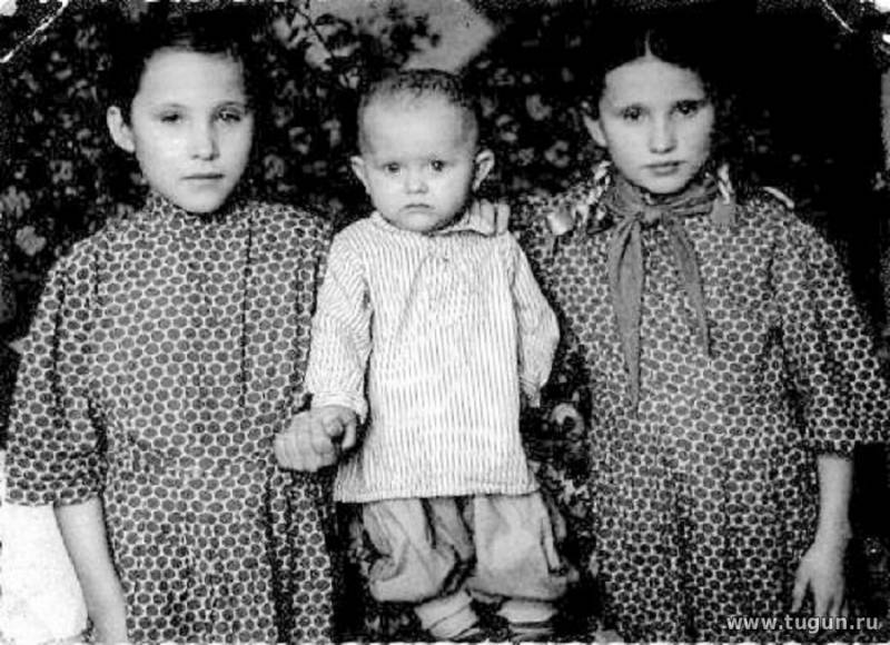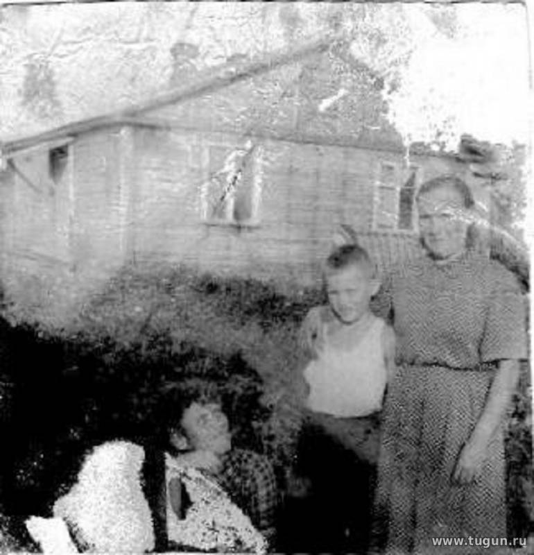 Лагерным распорядком для кормящих матерей было предусмотрено аааагромнейшее по- социалистически гуманное послабление – им давалось в течение дня два перерыва по полчаса на кормление ребенка (естественно без снижения нормы выработки). Как вспоминала мать, она делала соску из внутренней части луковицы (посмотрите – действительно по форме как соска !). Туда она помещала в тряпочке «жованку» - жеваный хлеб с сахаром. Самое трудное было в этом процессе – не проглотить сахар. Его доставали, покупали, выменивали (на что ?!?) отдельно от пайка. Видимо с этим луком я и получил ту свою ударную дозу витаминов и прочих иммунитетов- Вот уже 60 лет я ни разу не болел гриппом. Ходить «недоносок» начал в неполных восемь месяцев, ибо нужда заставляла, так было нужно. Очень трудно прятаться не умеющему ходить ! Чтобы иметь возможность чаще кормить меня, и вообще, чтобы был под присмотром материнских глаз, мать научилась носить меня от лазарета к теплицам и обратно под юбкой, где я, ловко обхватив материнскую ляжку и прижавшись к ней до полного слияния впервые вышел в большой мир .Для этого мать предприняла целую тактическую операцию с умышленным повреждение ноги (тоже рисковое дело), и чтобы окружающие привыкали к её хромой походке и потом не обращали на нее внимание. Так и приобрел я свое самое надежное и безопасное в мире убежище, куда ковылял, а потом уже и бегал прятаться при малейшем шухере. Сначала в теплице, потом в женском бараке, потом и на территории лагеря, куда детям вход был закрыт. Выпускали нас с матерю на волю в сентябре (снова сентябрь !) 1956 года по амнистии…55 года к десятилетию победы. Почти полтора года после приказа об амнистии важные дяди в погонах решали – стоит ли давать свободу столь опасным преступникам. Однако, "учитывая наличие троих несовершеннолетних детей, ходатайство мужа, реабилитированного и с возвращенной наградой, учитывая личное искреннее раскаяние осужденной…"Навстречу отцу, примчавшемуся встречать нас на выпрошенном у начальства грузовике, мать гордо вывела за ручку живого и здорового меня !!!! Услыхав слова матери:- «беги, вон папка тебя ждет !», увидев перед собой рыжую, кудрявую, оскалившуюся от уха до уха улыбающуюся и незнакомую морду, я гордо крикнул:-« а …уй тебе !!!» и ловко нырнул под материнскую юбку изо всех сил вцепившись в родную ляжку. (Много я потом имел неприятностей в детском саду по поводу моего специфического лексикона). По случаю радостного для семьи воссоединения вечером был приглашен фотограф. Сестры были наряжены в праздничные платья. Старшая сестра (круглая отличница) ни за что не хотела фотографироваться без пионерского галстука, чем сильно обидела младшую, которую в пионеры не приняли по причине наличия матери-уголовницы. «Вот если бы хотя бы училась как старшая…». Так нас и запечатлили на первой в нашей семейной истории семейной фотографии. Младшая из сестер крепко держала меня за руку, старшая удерживала на месте за плечо, так как я все время норовил спрятаться… ну вы уже знаете куда. Я вообще не понимал, что происходит вокруг, кто эти люди, потому и получился таким малость воинственным, готовым в любой миг оскалиться и постоять за себя. Что и продемонстрировал в первый же вечер и сестрам и отцу, покусав их при попытках вытащить…. Ну вы уже знаете откуда.