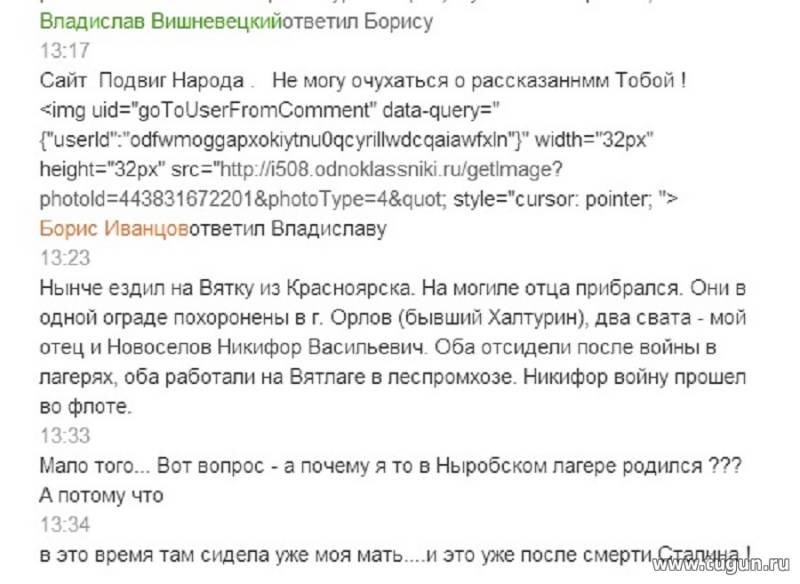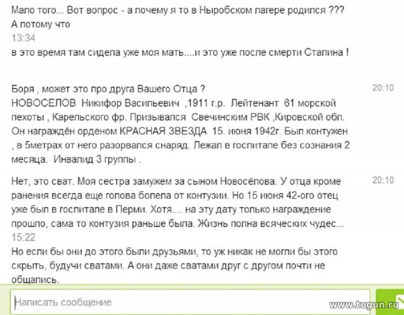 Оказывается у нас у обоих одна «Малая Родина» - П/я «319». Потом мы с ней жили на одной улице и ходили в один детский садик. Они уехали из Ныроба на следующий год после нас. Уехали в Казахстан, где она стала заслуженной артисткой Республики, очень рано, в 45 лет вышедшей на пенсию. Такие они – балерины… Она сейчас у меня в друзьях на «Одноклассниках». Что с того, что не привелось вместе учиться, зато от рыжего мордовского вертухая прятались под одним крыльцом. Но он всё же иногда ловил нас и разламывал одну печенюшку на двоих. И как-то в разговоре с ней, мы решили, что тоже можем считать себя победителями, как наши отцы и матери. Они победили врага, мы - победили судьбу, выжив назло ей !!!!